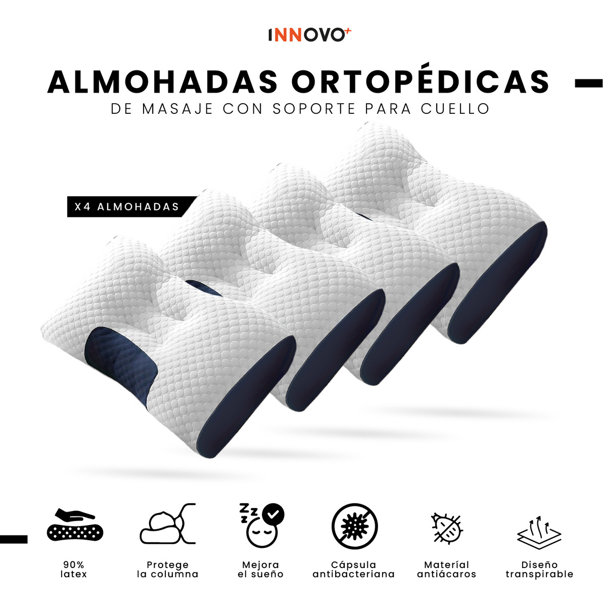 Renueva tu descanso con el Pack de 4 Almohadas Semi Ortopédicas Innovo+, diseñadas con tecnología foam y látex de alta calidad que se adapta a la forma natural de tu cuello y cabeza. Este set es perfecto para familias, parejas o quienes desean reemplazar varias almohadas a la vez con una opción ergonómica, hipoalergénica y duradera.