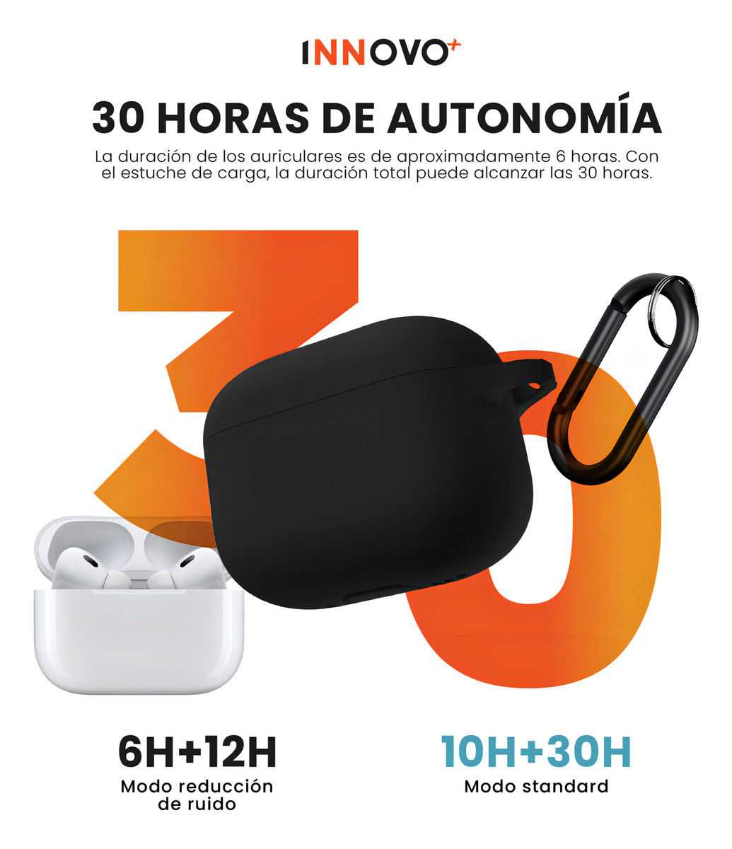 Disfruta de tu música, llamadas y entretenimiento sin interrupciones con los audífonos inalámbricos Innovo+, diseñados para ofrecerte la mejor experiencia de sonido con larga duración de batería y estuche protector premium.