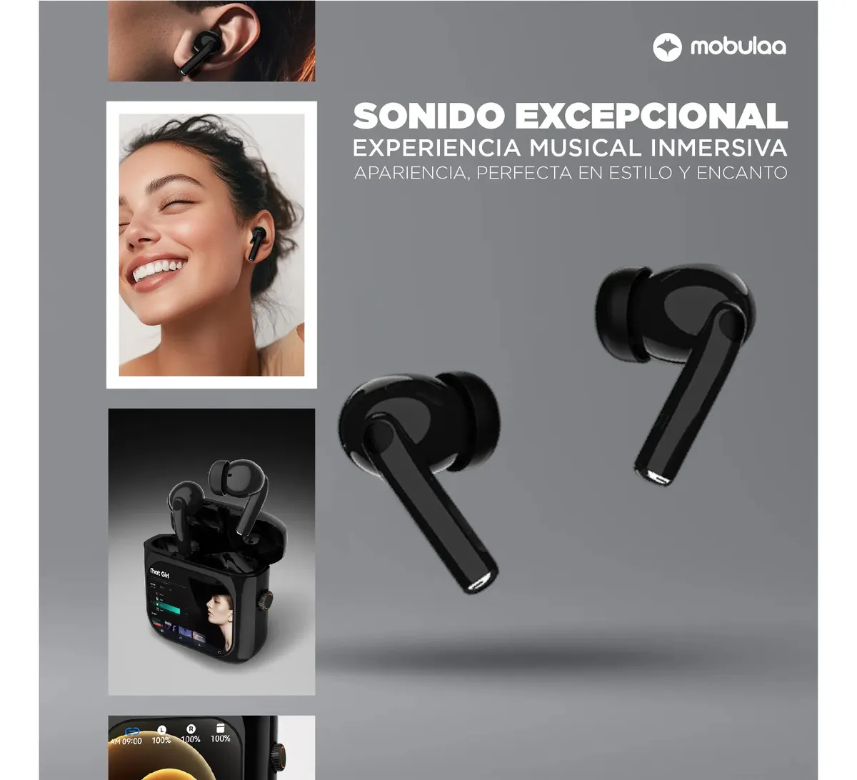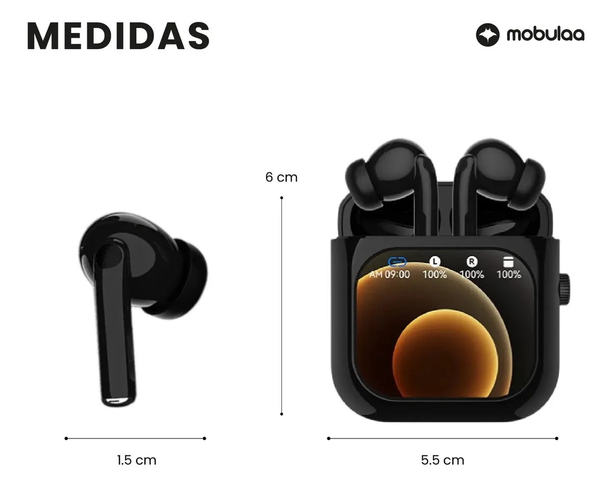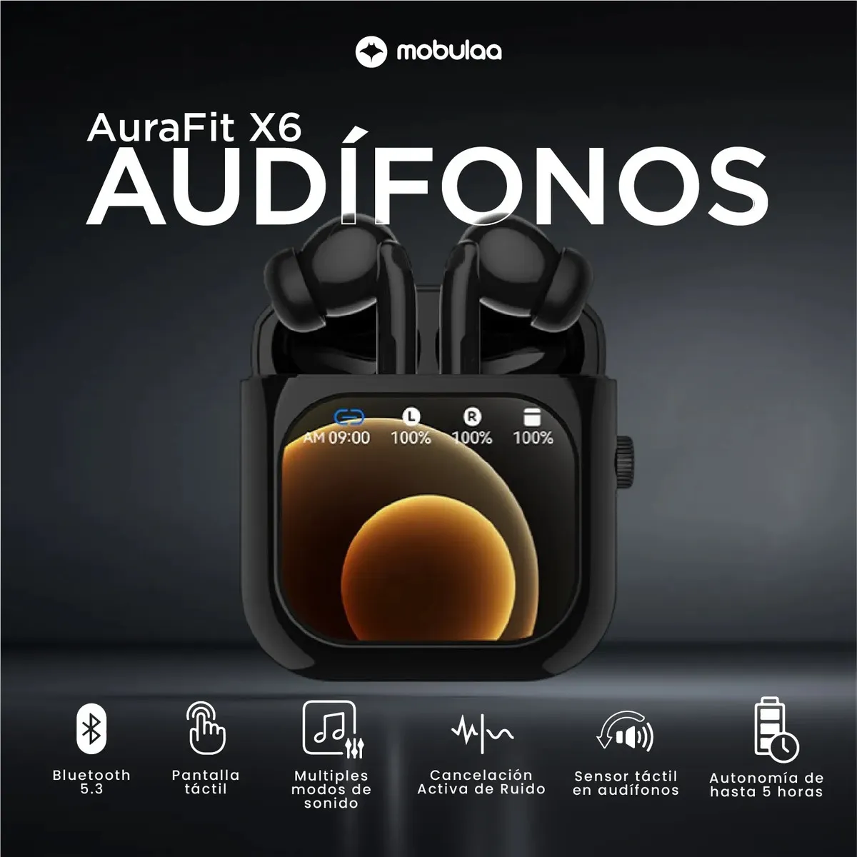 Los nuevos Mobulaa AuraFit X6 revolucionan tu experiencia auditiva con el primer estuche de carga inteligente equipado con una pantalla táctil a color. Control total, sin distracciones.