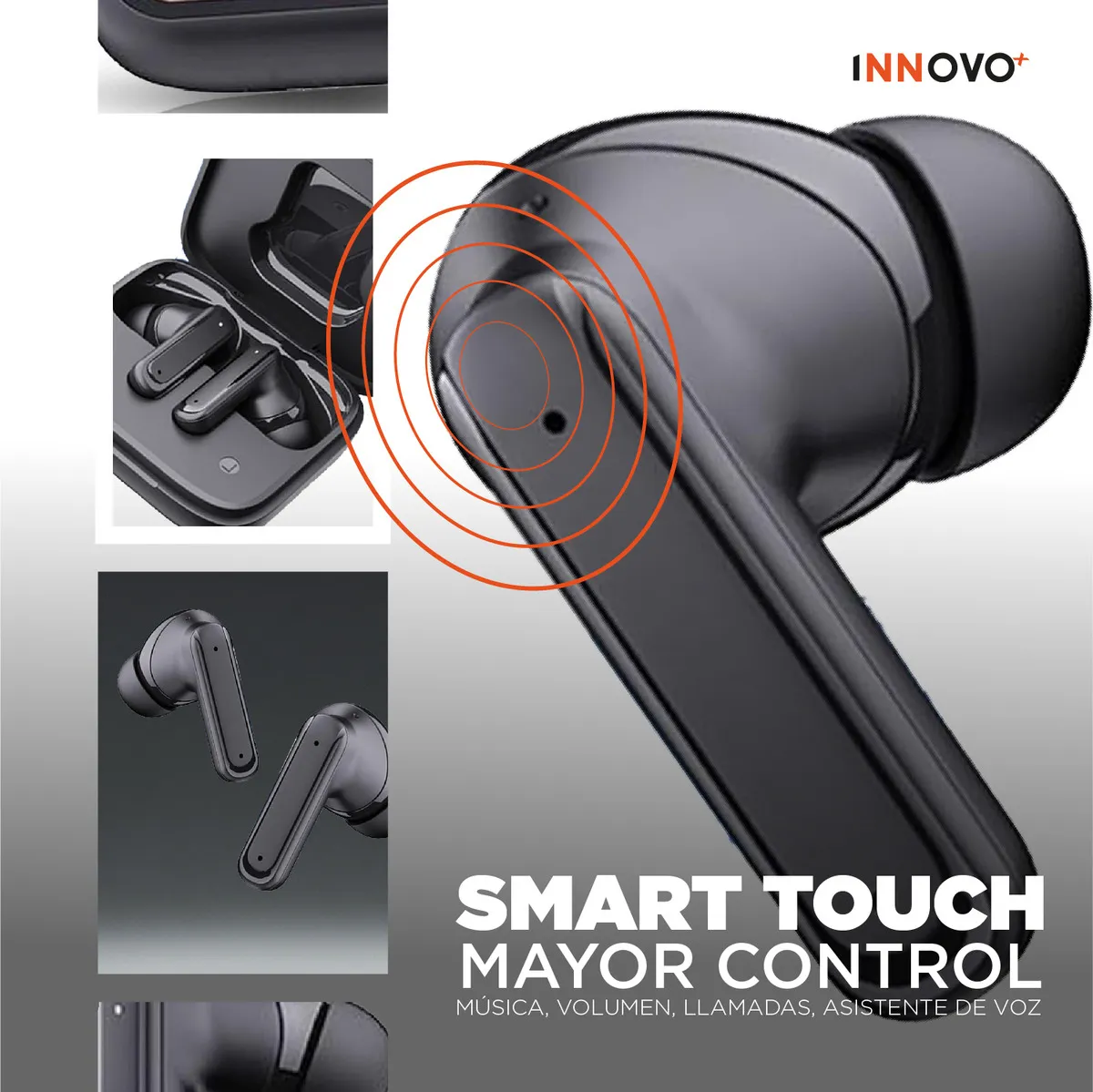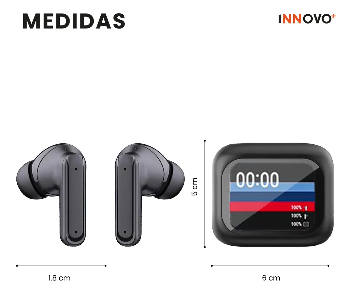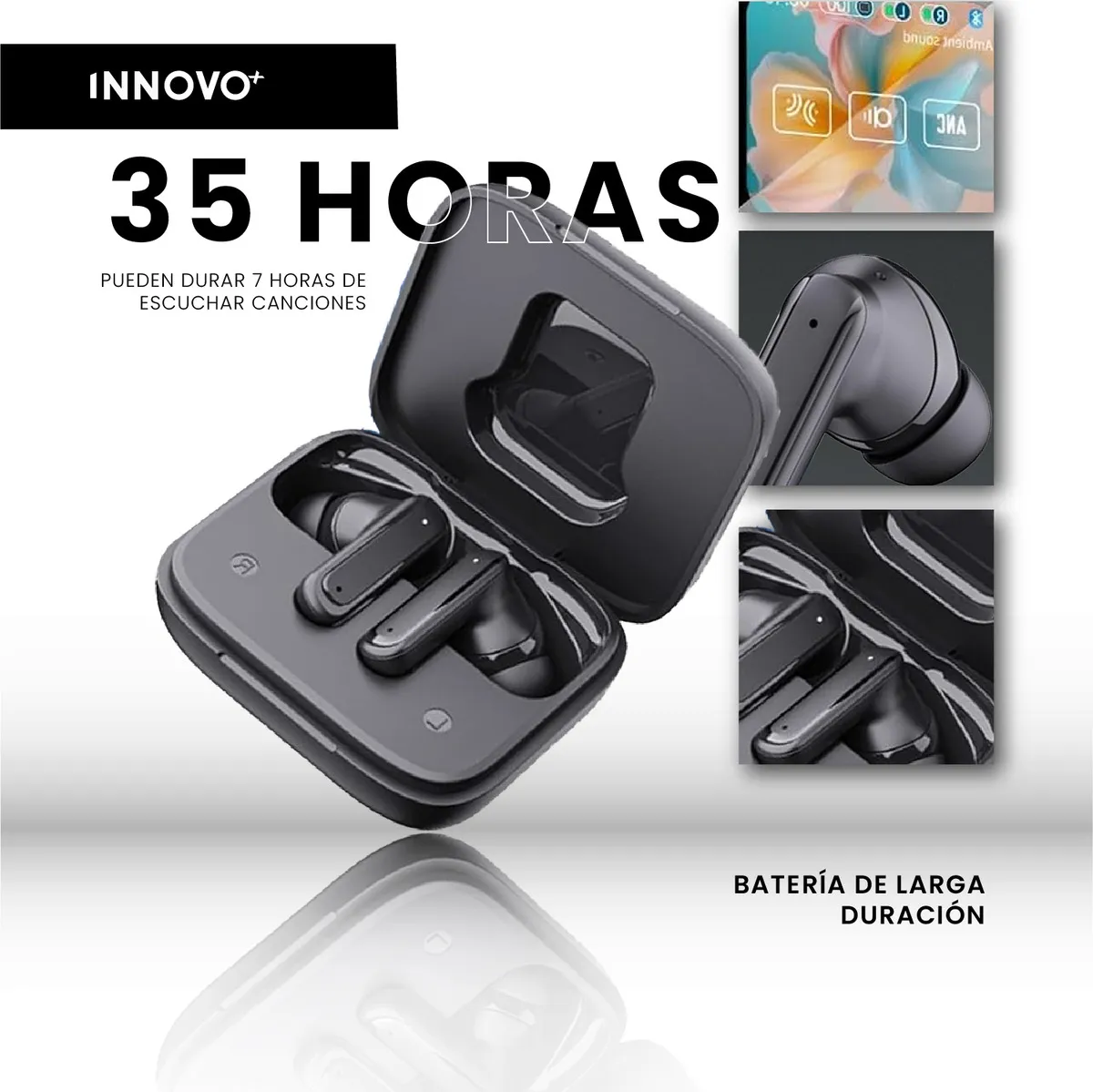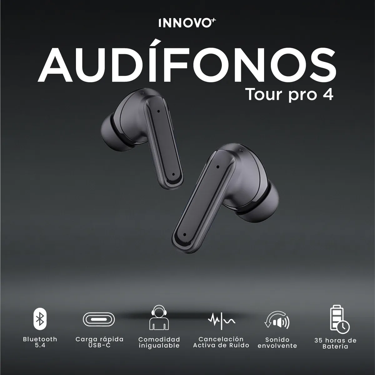 Disfruta una experiencia auditiva superior con los INNOVO+ Tour Pro 4, los audífonos ideales para quienes buscan sonido premium, control inteligente y una autonomía excepcional de hasta 35 horas. Su estuche con pantalla táctil de 1.45” te permite visualizar batería, llamadas y modos de audio de forma rápida y elegante.