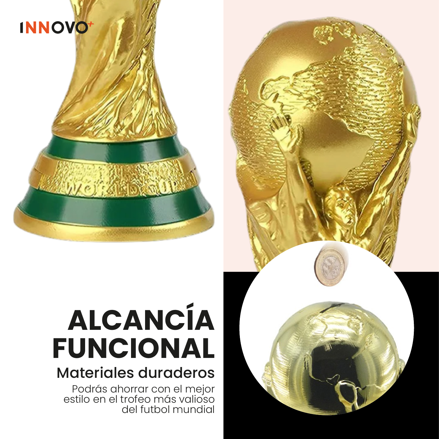 El Trofeo de tus Sueños (Con un Secreto): No es solo una réplica de la Copa del Mundo de 30 cm con acabado dorado premium. Es también una Alcancía Funcional de alta resistencia. Ahorra para tu próximo viaje al estadio mientras decoras tu oficina o habitación con el máximo símbolo de victoria.