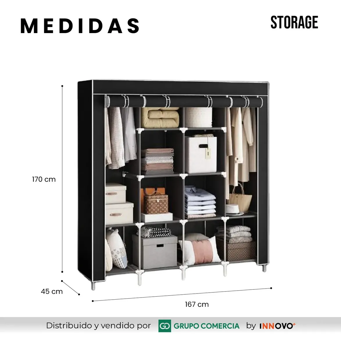 Con un ancho imponente de 167 cm, este armario no es solo un estante; es un sistema de organización completo diseñado para proteger tu ropa y maximizar cada centímetro de tu hogar.