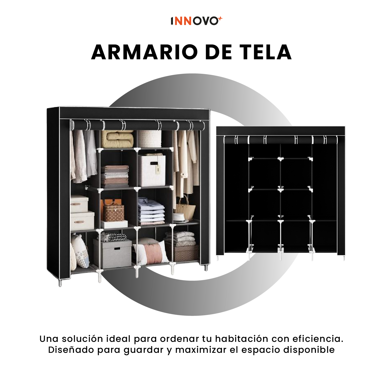 Organiza tu ropa y accesorios de manera práctica y elegante con el Clóset Organizador de Tela Innovo+. Su diseño moderno en color negro con forro protector y 12 compartimentos te permite aprovechar al máximo cada rincón de tu habitación.