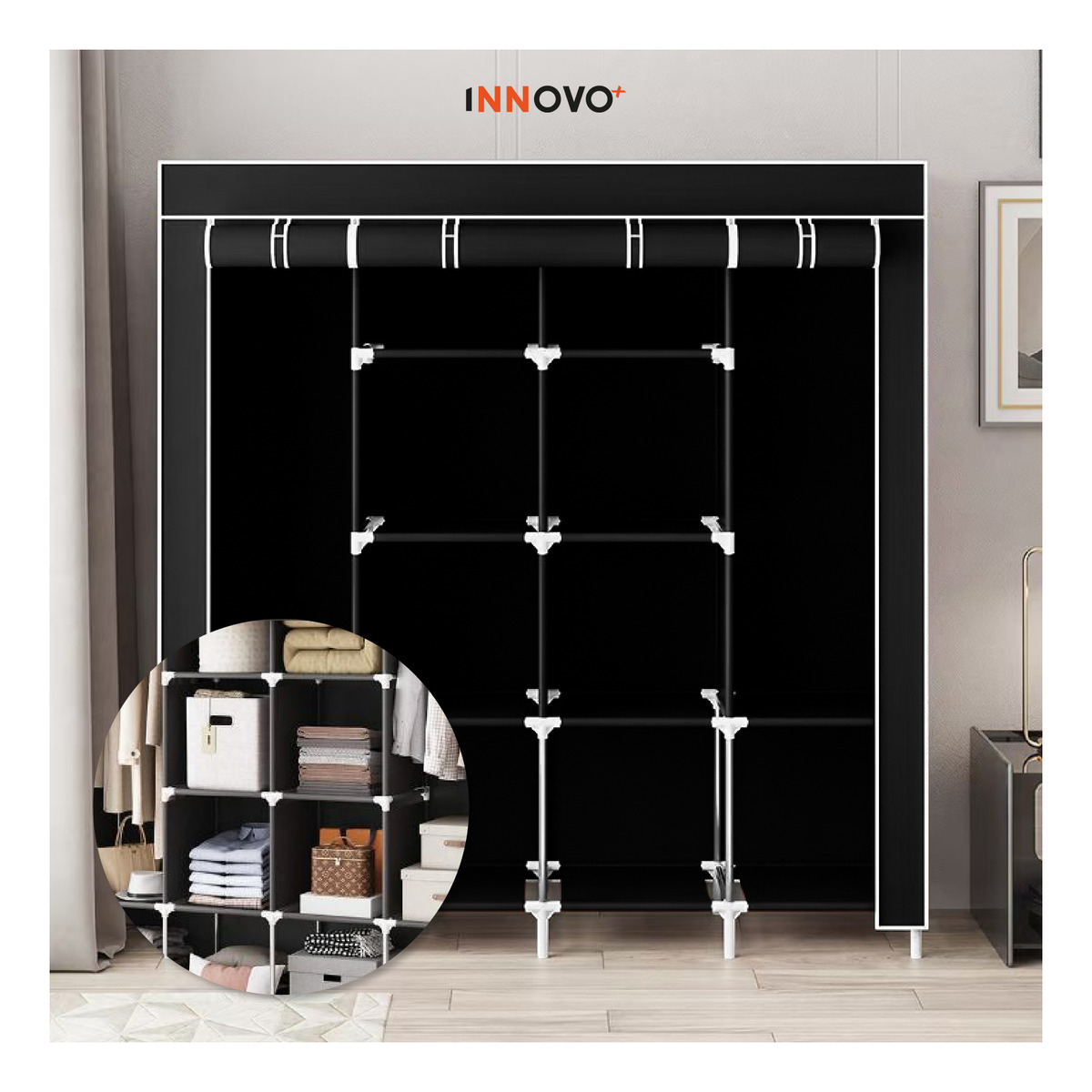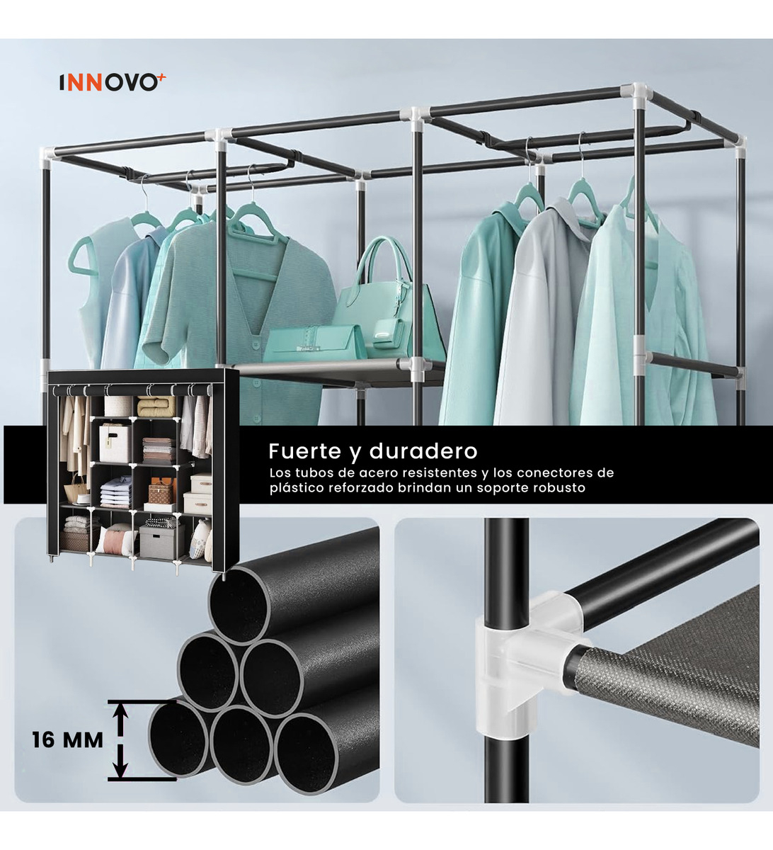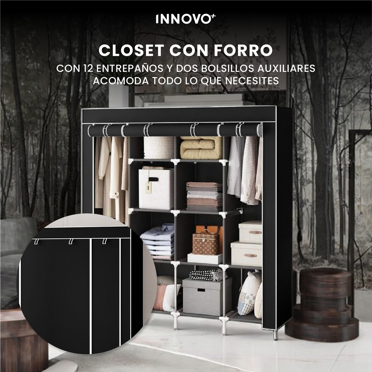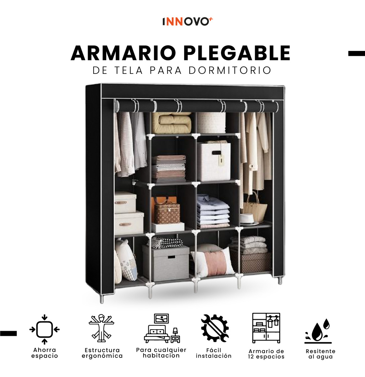 Organiza tu ropa y accesorios de manera práctica y elegante con el Clóset Organizador de Tela Innovo+. Su diseño moderno en color negro con forro protector y 12 compartimentos te permite aprovechar al máximo cada rincón de tu habitación.