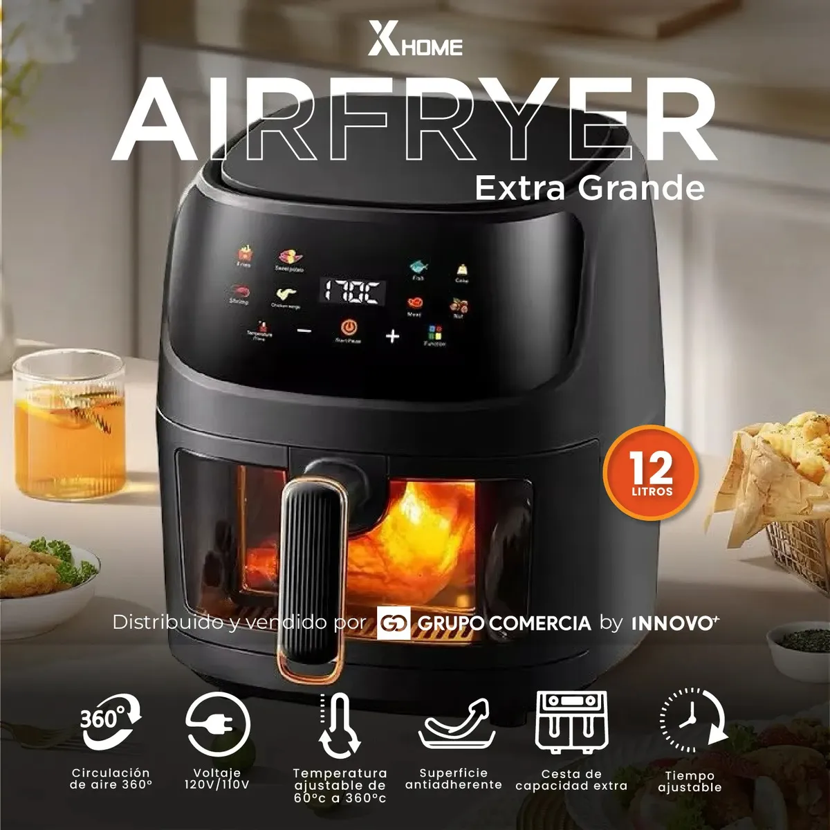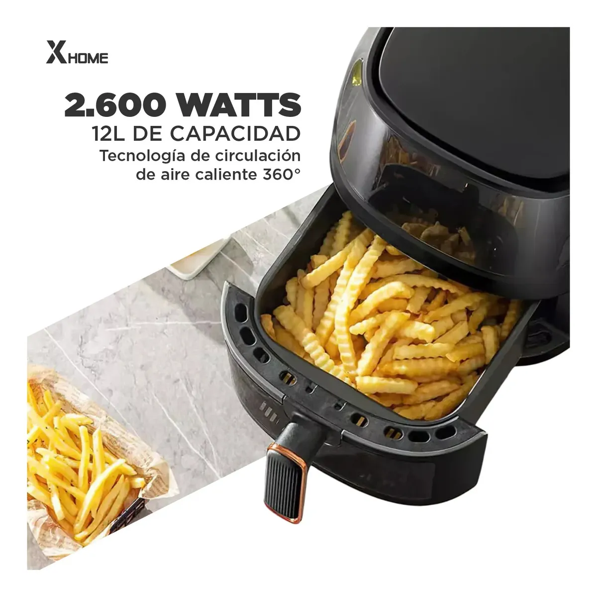 Un Banquete para Todos (12L de Capacidad): Se acabó el cocinar por turnos. Su cesta extra-grande de 12 litros tiene espacio suficiente para un pollo entero o una porción masiva de papas fritas. Prepara cenas familiares completas en una sola tanda, ahorrando tiempo y energía.