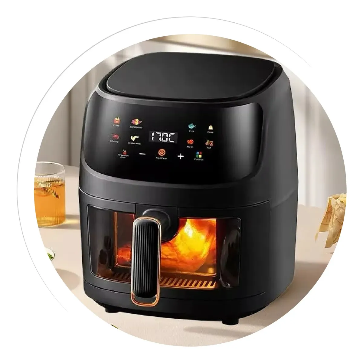 Más que una Freidora, es tu Aliado en la Cocina. Su diseño moderno en negro piano y detalles en bronce eleva la estética de cualquier cocina. Además, es tan versátil que puedes usarla para asar verduras, tostar frutos secos, deshidratar frutas o simplemente recalentar pizza y dejarla como recién hecha.