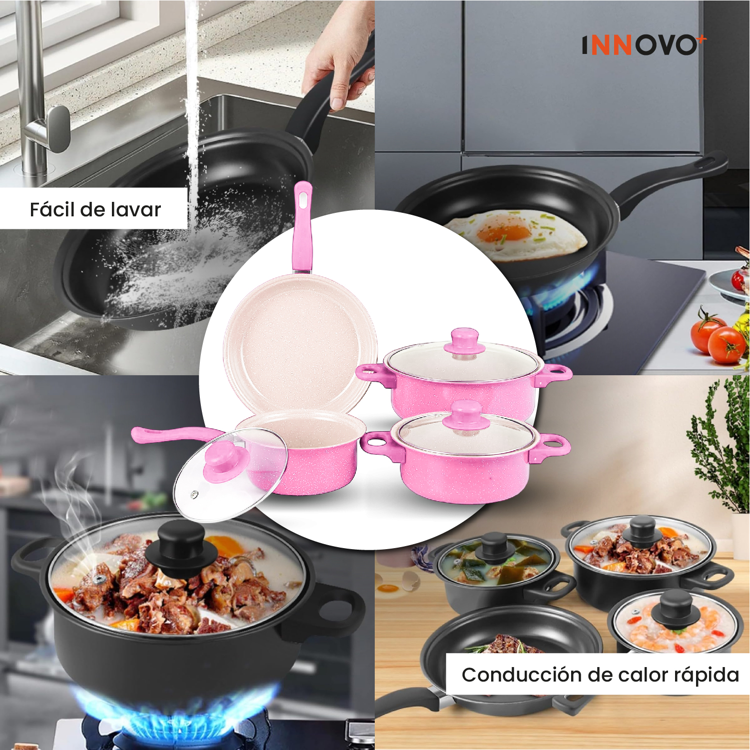 Ollas y sartén con recubrimiento antiadherente que facilita la cocción y limpieza.