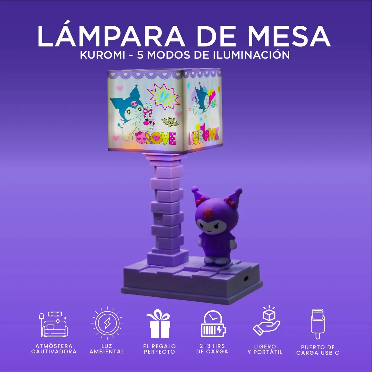 ¿Buscas transformar tu habitación en un refugio lleno de estilo y personalidad? Nuestra Lámpara de Mesa Kuromi Edición Especial no es solo un accesorio de iluminación, es la pieza de diseño que le falta a tu escritorio o mesita de noche. Con su estética única y su vibrante color púrpura, captura perfectamente la esencia rebelde y tierna de tu personaje favorito de Sanrio.