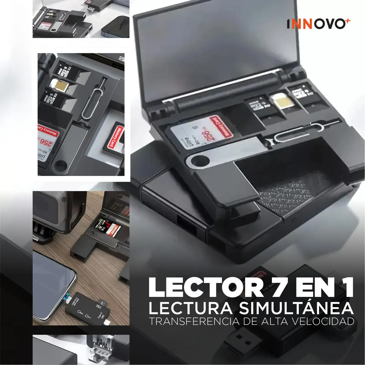 Transforma la forma en que gestionas tus archivos con este Lector de Tarjetas 7 en 1 USB–OTG–SD, el accesorio perfecto para fotógrafos, creadores de contenido, estudiantes y cualquier persona que necesite transferir datos de forma rápida, segura y sin complicaciones.