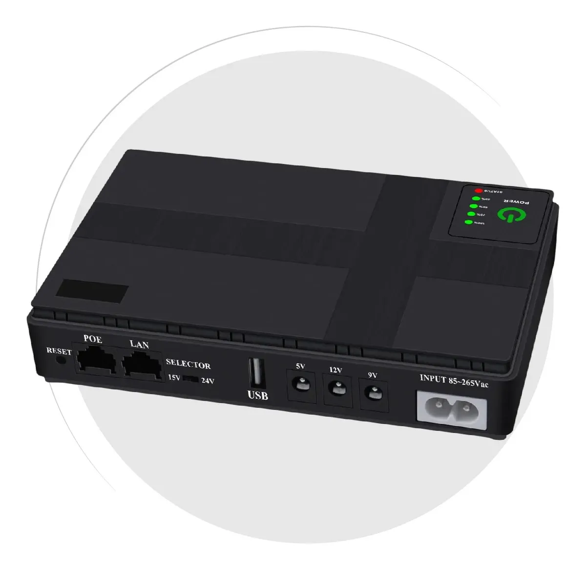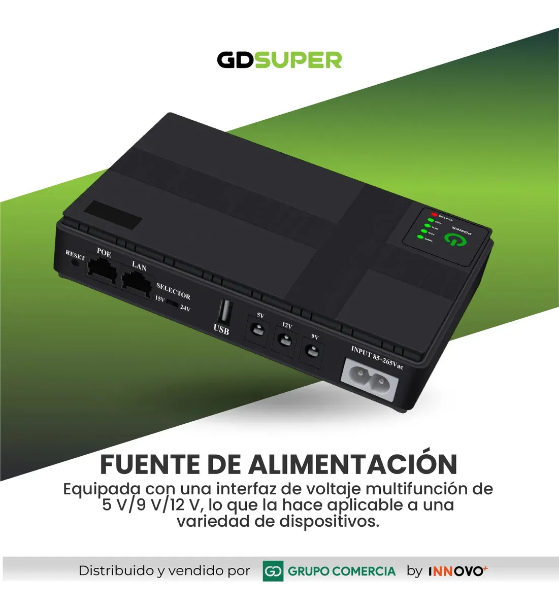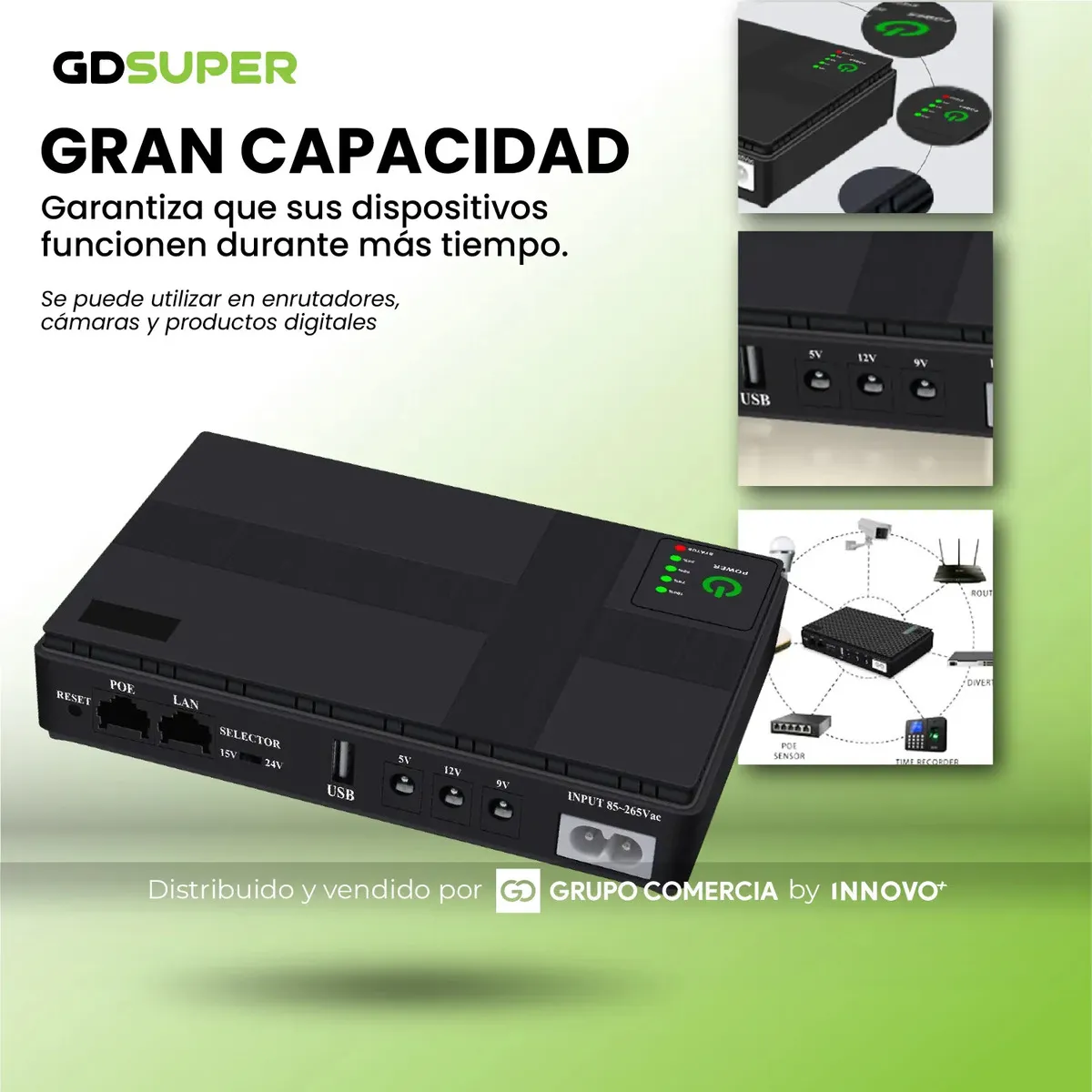 Versatilidad Total (Multivoltaje): Equipada con salidas de 5V, 9V, 12V y puertos POE (15V/24V). Es compatible con el 99% de los routers, módems, cámaras CCTV y sistemas biométricos del mercado.