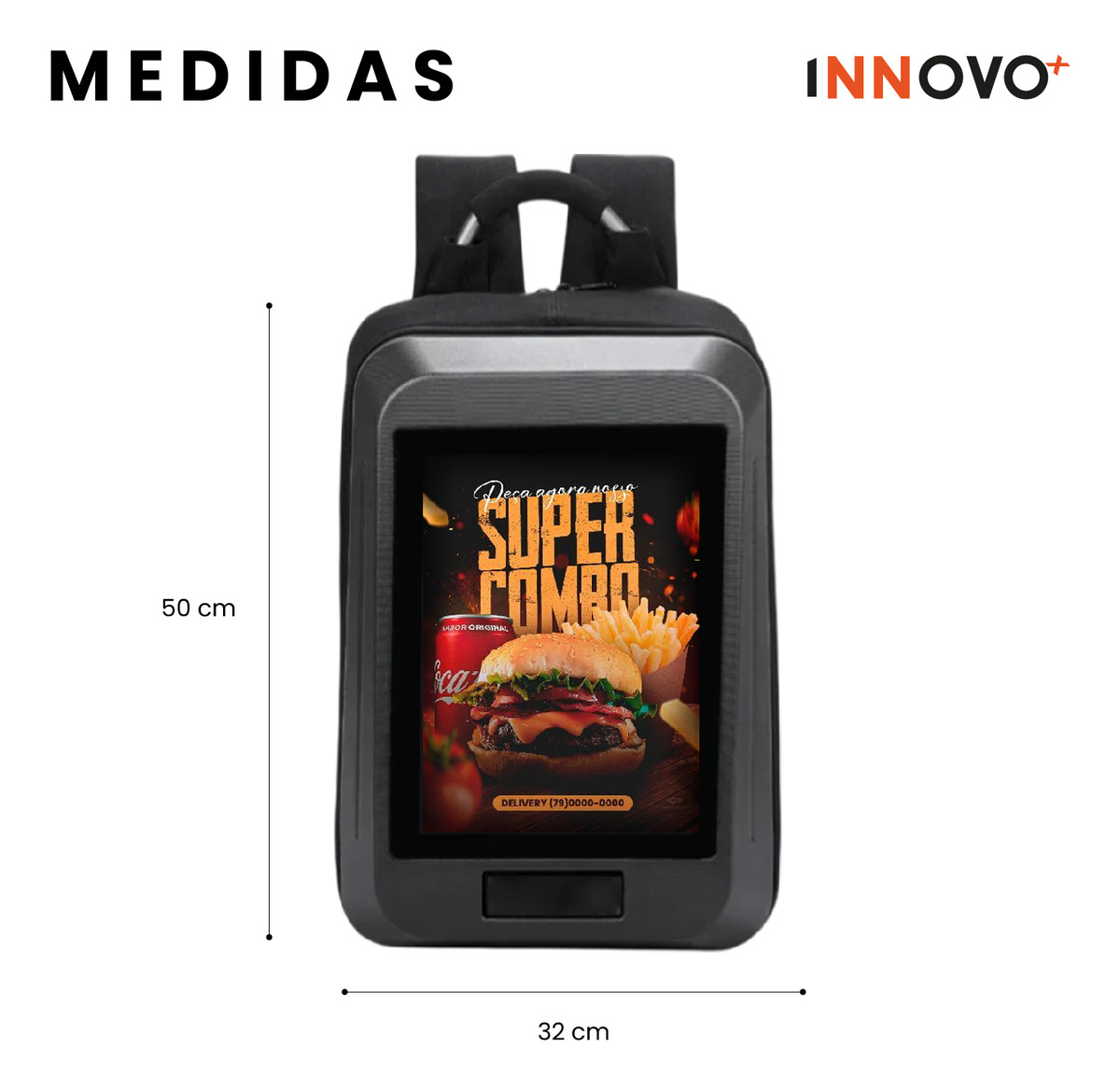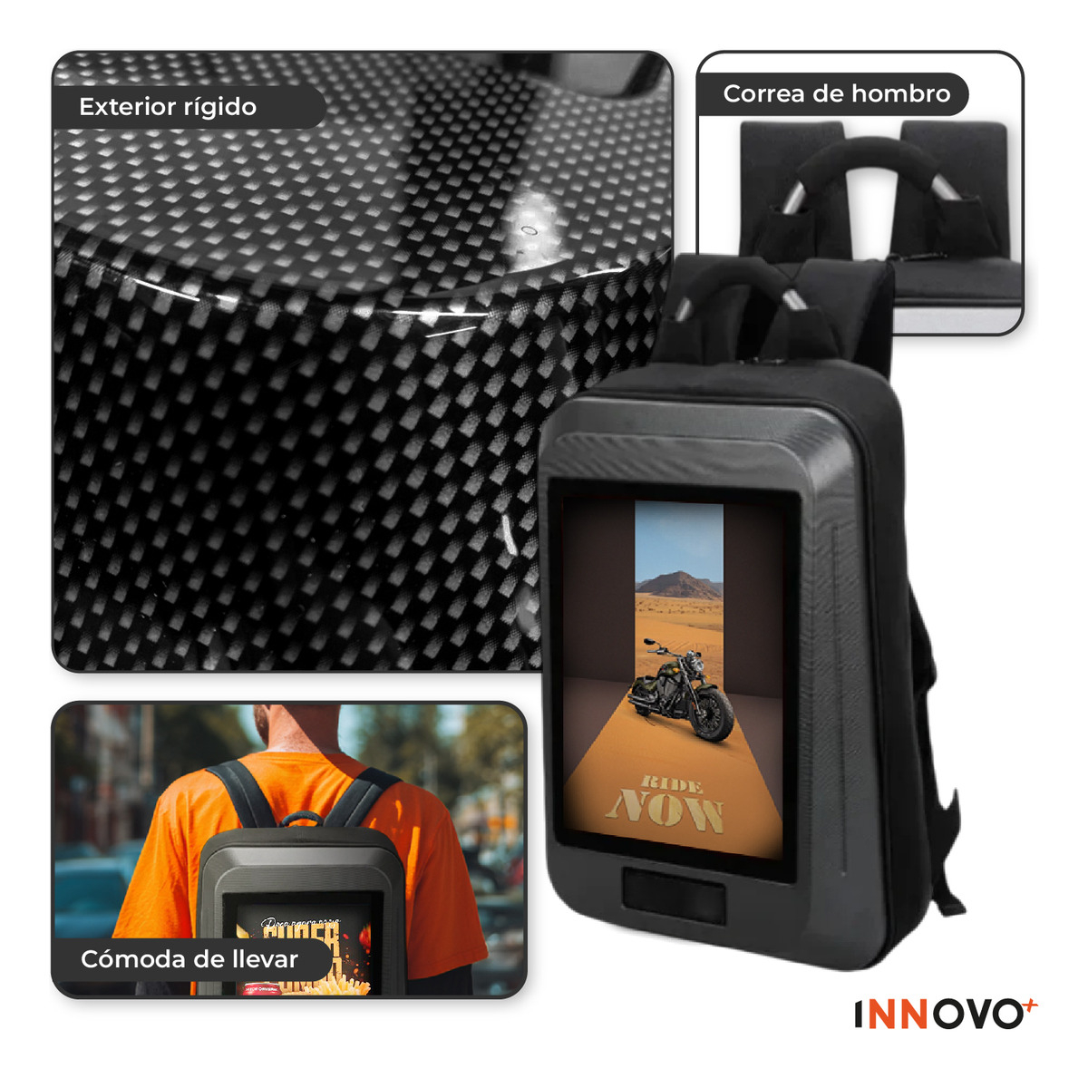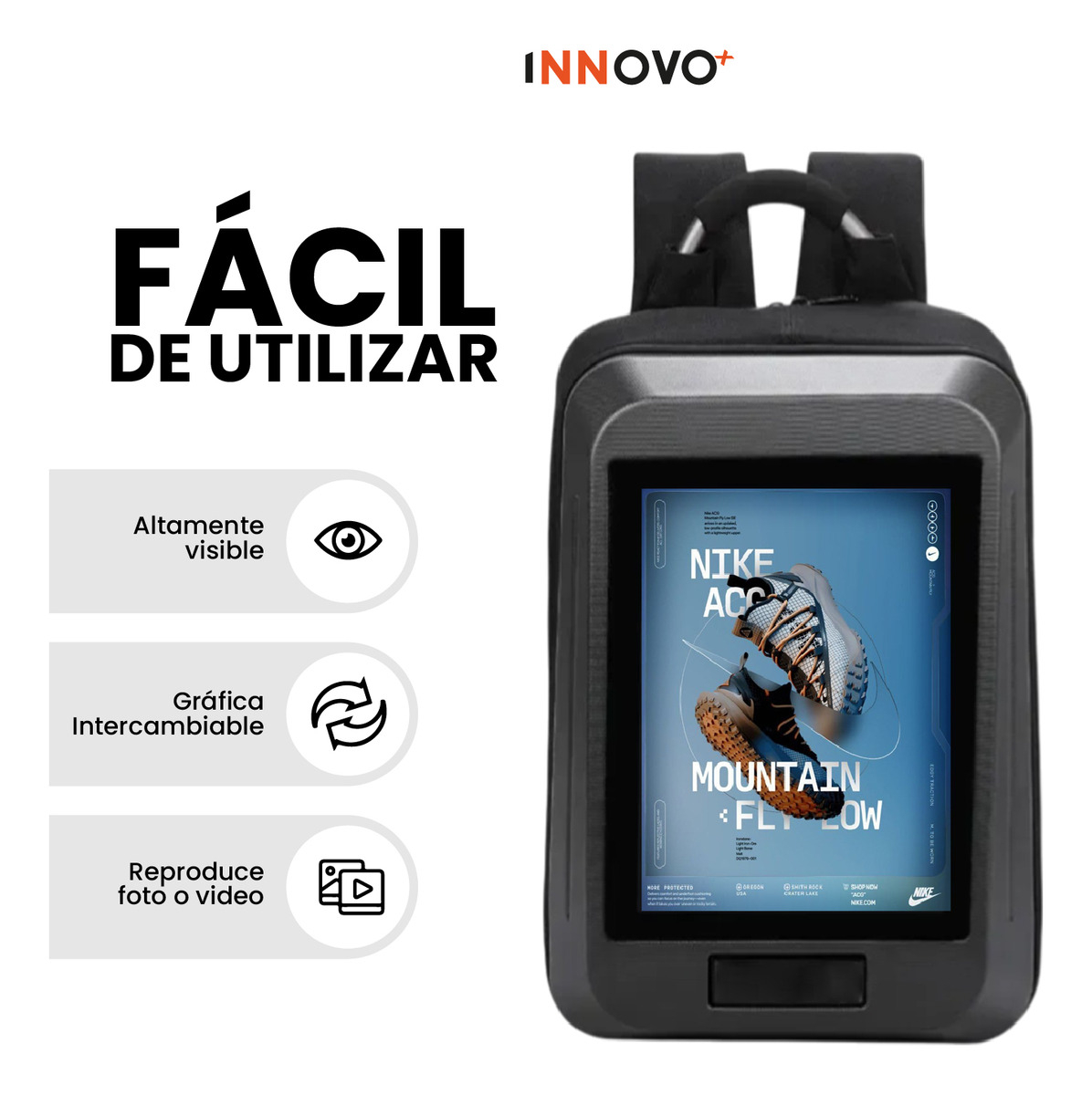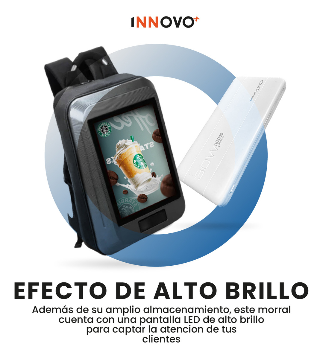 Esta mochila publicitaria de Innovo+ está diseñada para emprendedores, promotores y marcas que buscan visibilidad en movimiento. Cuenta con una pantalla LED full color de alta resolución que reproduce imágenes y videos, permitiéndote mostrar contenido dinámico en tiempo real. Incluye power bank, conexión USB y estructura resistente al agua, ideal para promociones en exteriores o eventos.