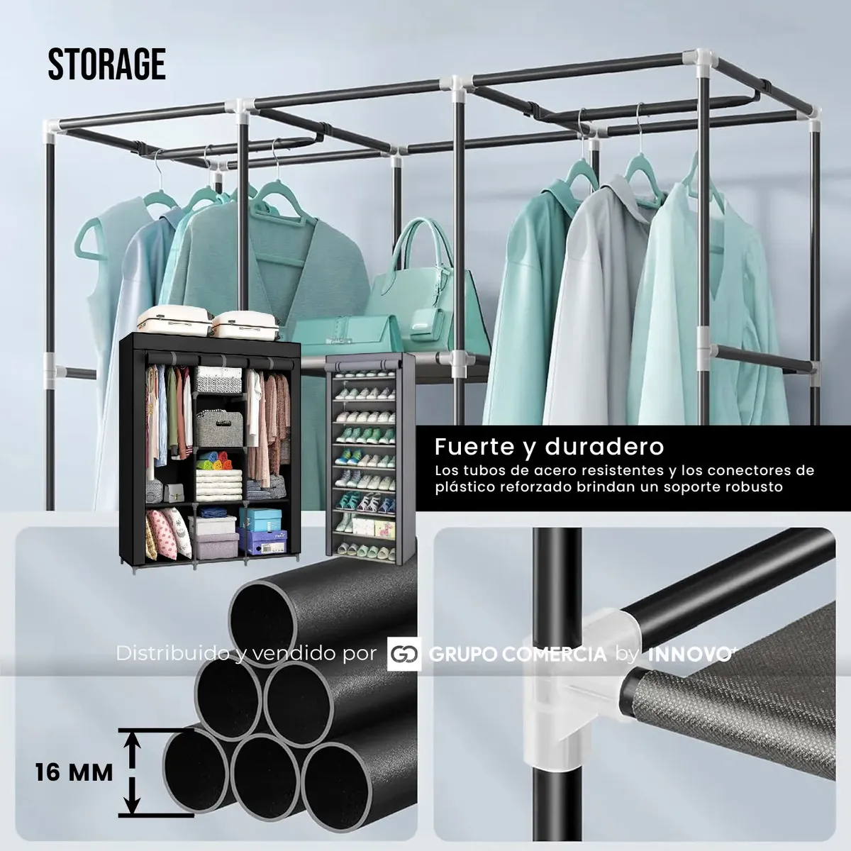 Capacidad Inteligente: Cuenta con 6 estantes pequeños y 2 compartimentos grandes ideales para ropa colgada o cajas organizadoras.