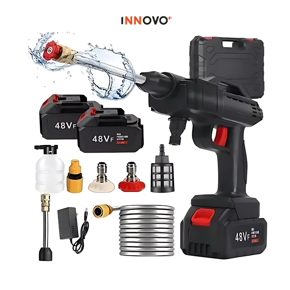 La Hidrolavadora Inalámbrica 48VF + Cargador Iniciador de Batería 12V es el combo ideal para limpiar con potencia y mantener tu vehículo siempre listo.