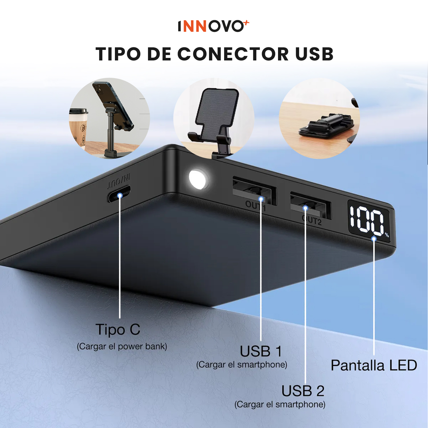 Disfruta del combo más práctico y moderno de INNOVO+: un Power Bank de 10.000mAh con pantalla LED y un soporte plegable ajustable ideal para tu celular o tablet. Perfecto para viajes, trabajo o entretenimiento en casa.