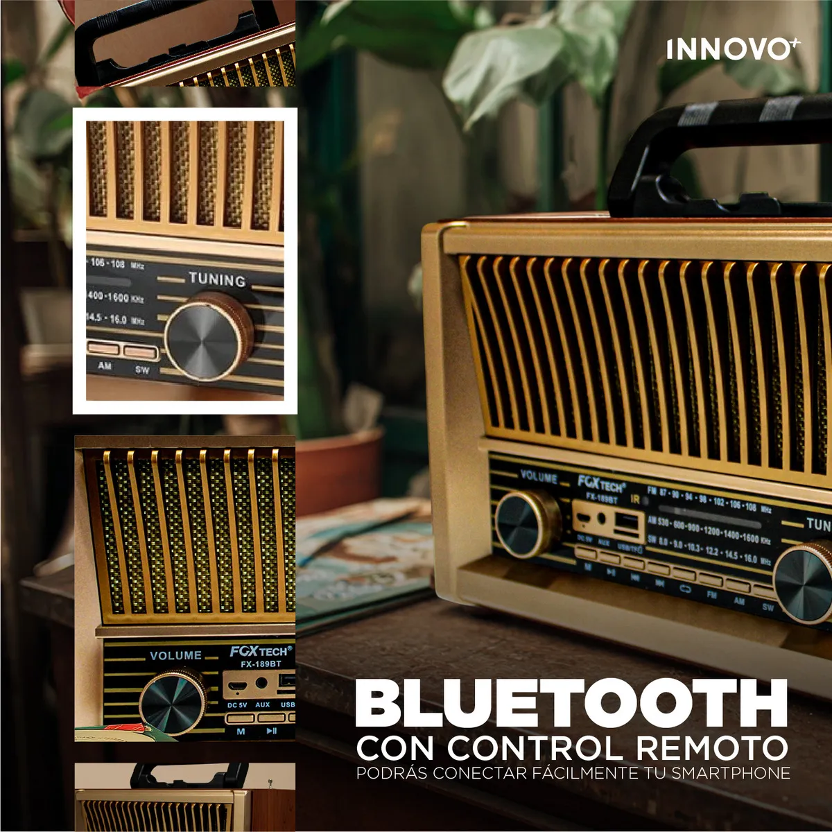 Lleva a tu hogar o negocio un toque retro con la Radio Vintage FX-189BT Innovo+, un parlante potente con diseño clásico que combina elegancia, estilo y sonido estéreo de alta calidad.