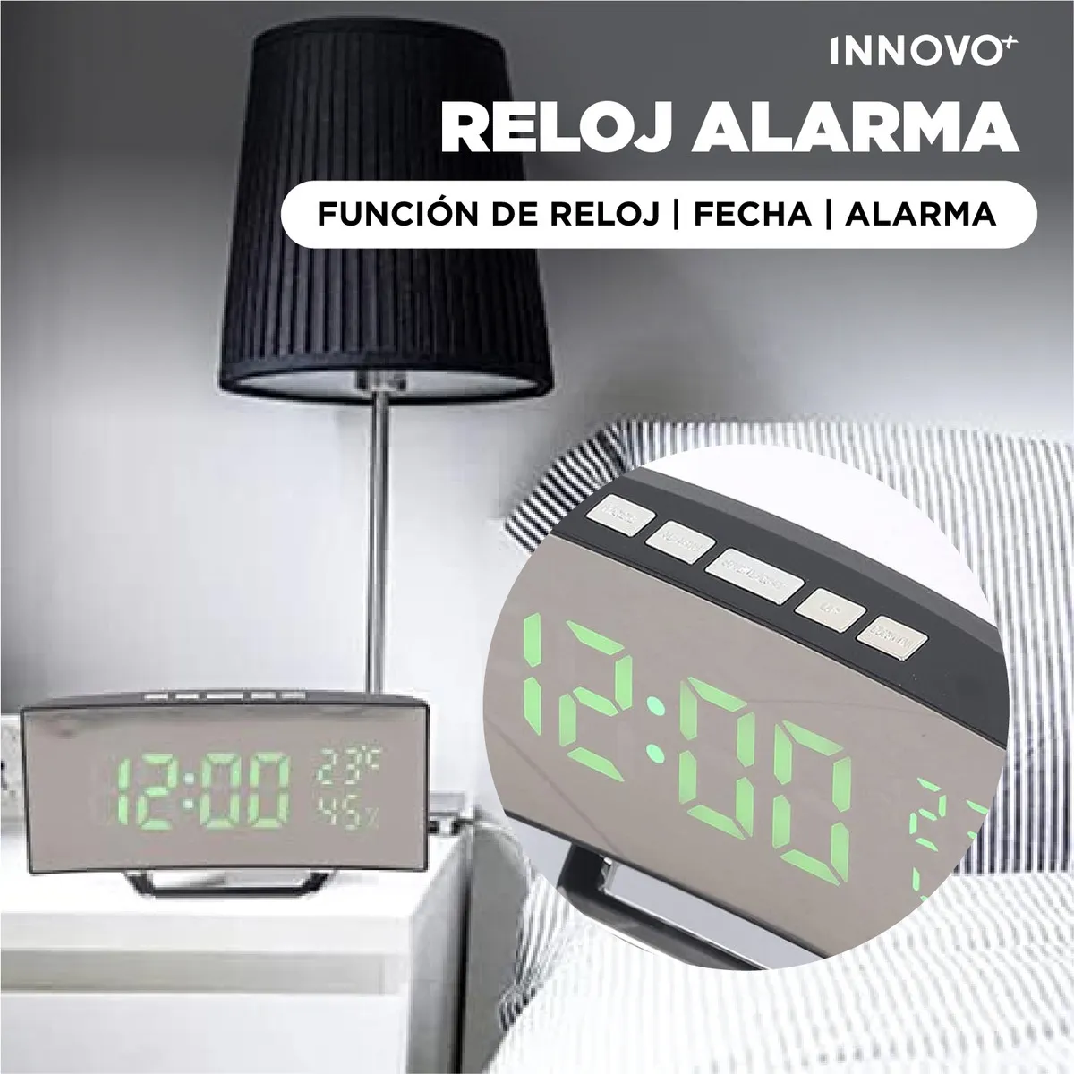 Dale un toque sofisticado a tu mesa de noche u oficina con el Reloj LED Digital Innovo+. Más que un simple reloj, es una pieza de diseño con pantalla curva tipo espejo que combina funcionalidad avanzada con un estilo minimalista único.