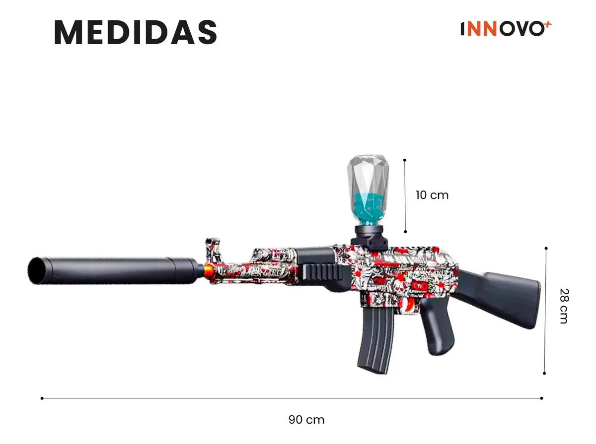 Lleva la acción de los videojuegos a la vida real con el Rifle AK-47 de Hidrogel Innovo+, la ametralladora de gel más buscada del momento. Su diseño robusto, tamaño realista de 90 cm de largo y su disparo automático por ráfagas lo convierten en el juguete perfecto para niños, jóvenes y adultos.