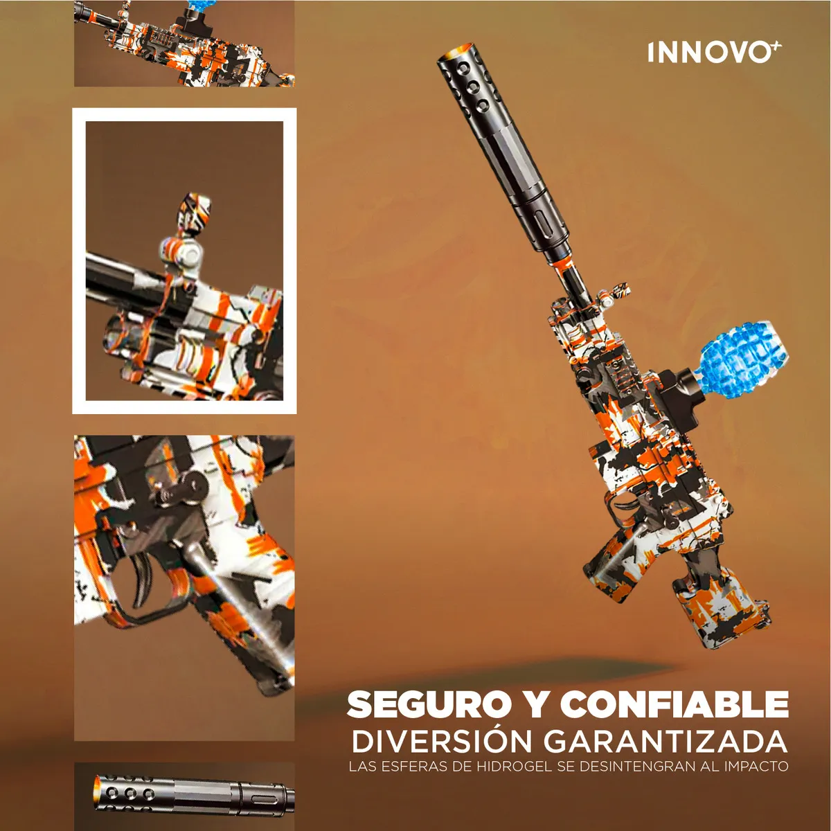 Este rifle utiliza esferas de hidrogel biodegradables, que se desintegran al impactar, evitando desorden y reduciendo riesgos. Además, incluye una botella de recarga superior para un suministro continuo de munición y una batería incorporada para un uso cómodo y práctico.