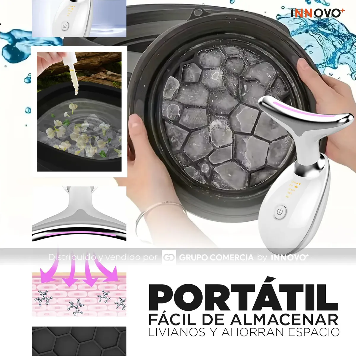 Paso 1: El Poder del Hielo (Crioterapia): Utiliza nuestro cuenco plegable con rejilla integrada para crear una terapia de frío instantánea. El contacto del agua helada contrae los poros, desinflama las ojeras y activa la circulación, dejando tu rostro con una frescura envidiable.