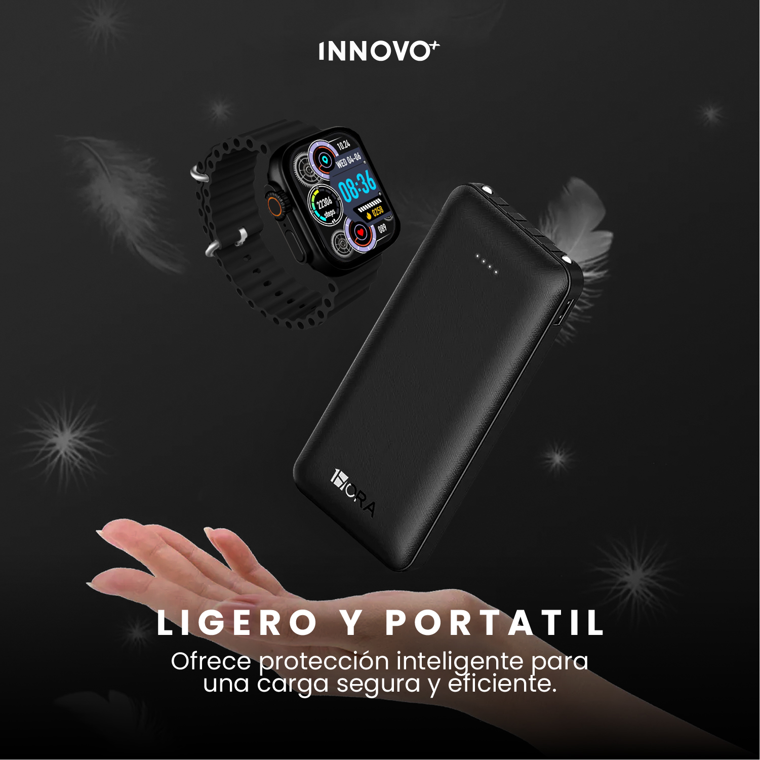 Incluye una Power Bank de 10,000 mAh con cables integrados para que cargues tu smartwatch, celular o cualquier dispositivo estés donde estés.