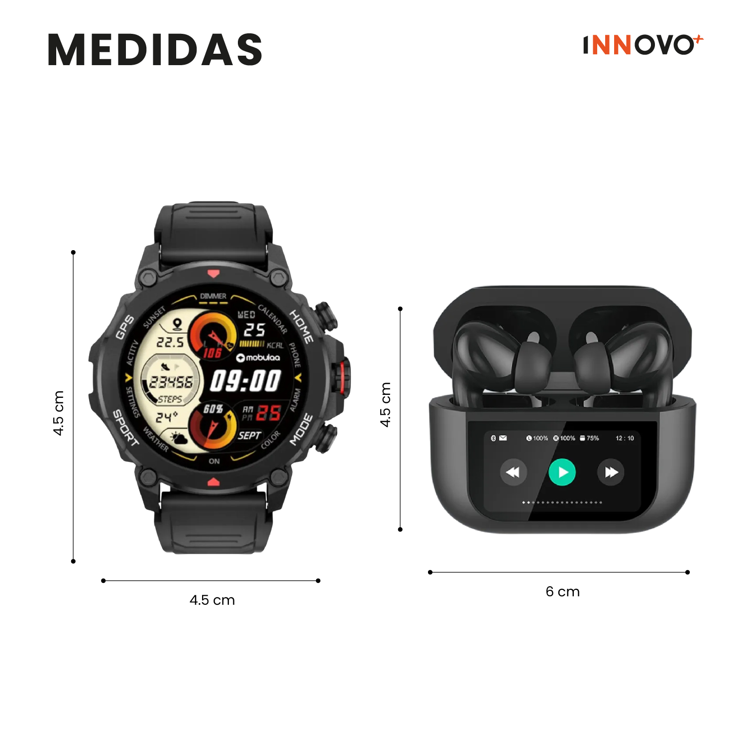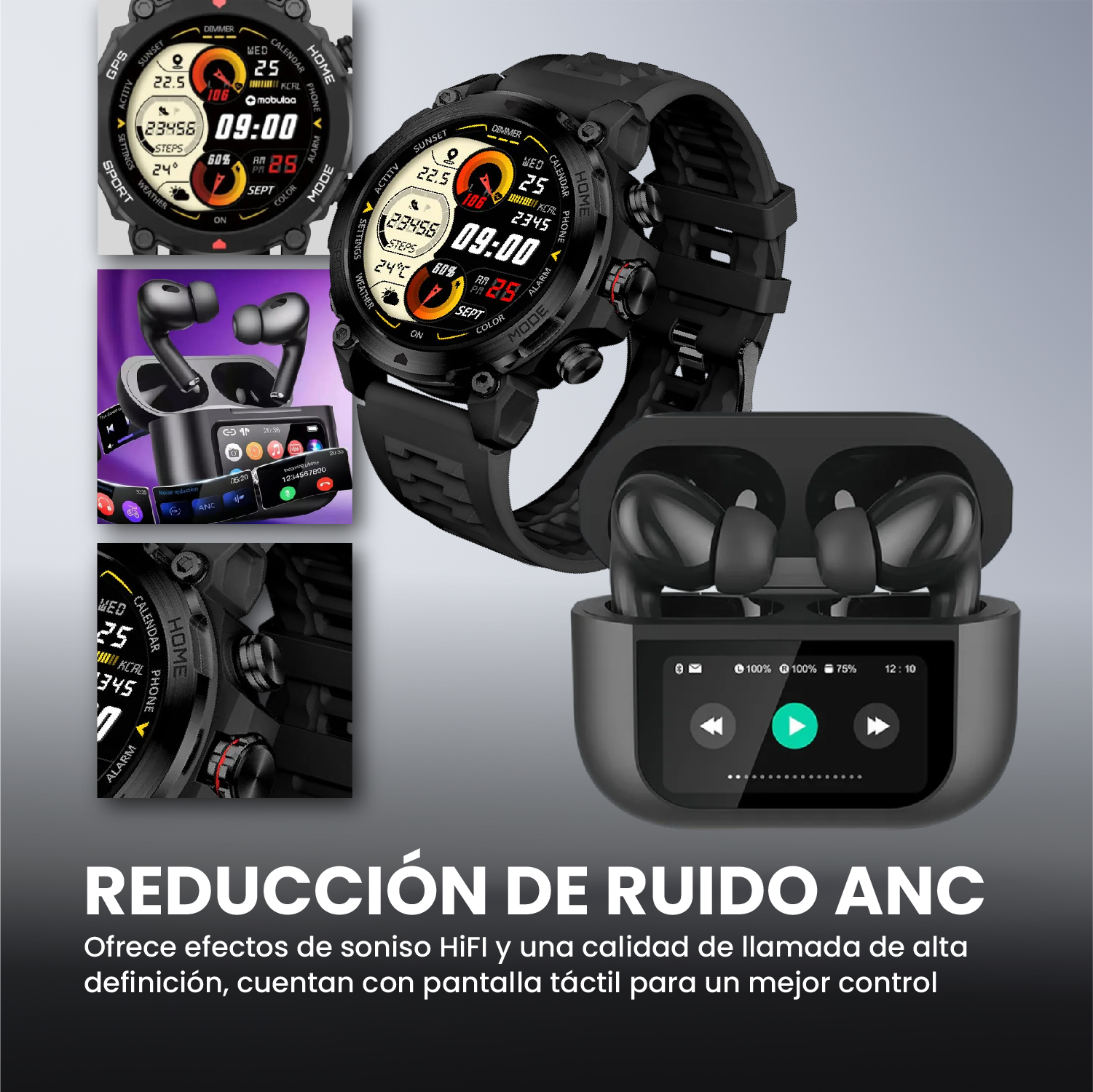 Lo nunca antes visto: el estuche de carga incluye una pantalla táctil inteligente que te permite controlar todo sin sacar el celular.
