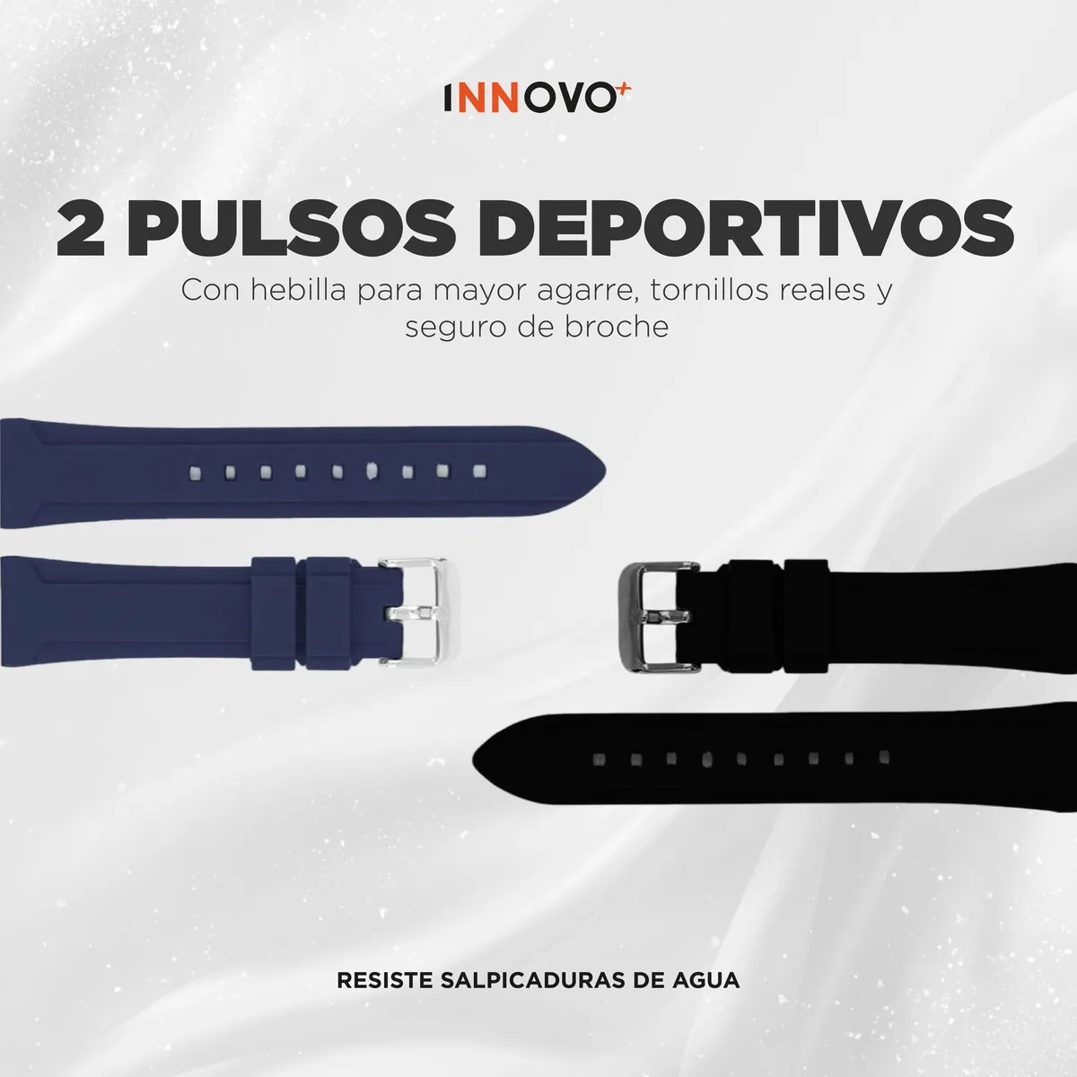 Este modelo incluye 2 correas deportivas (negra + azul), resistencia IP68, batería de hasta 7 días, carga inalámbrica y compatibilidad total con iPhone y Android.