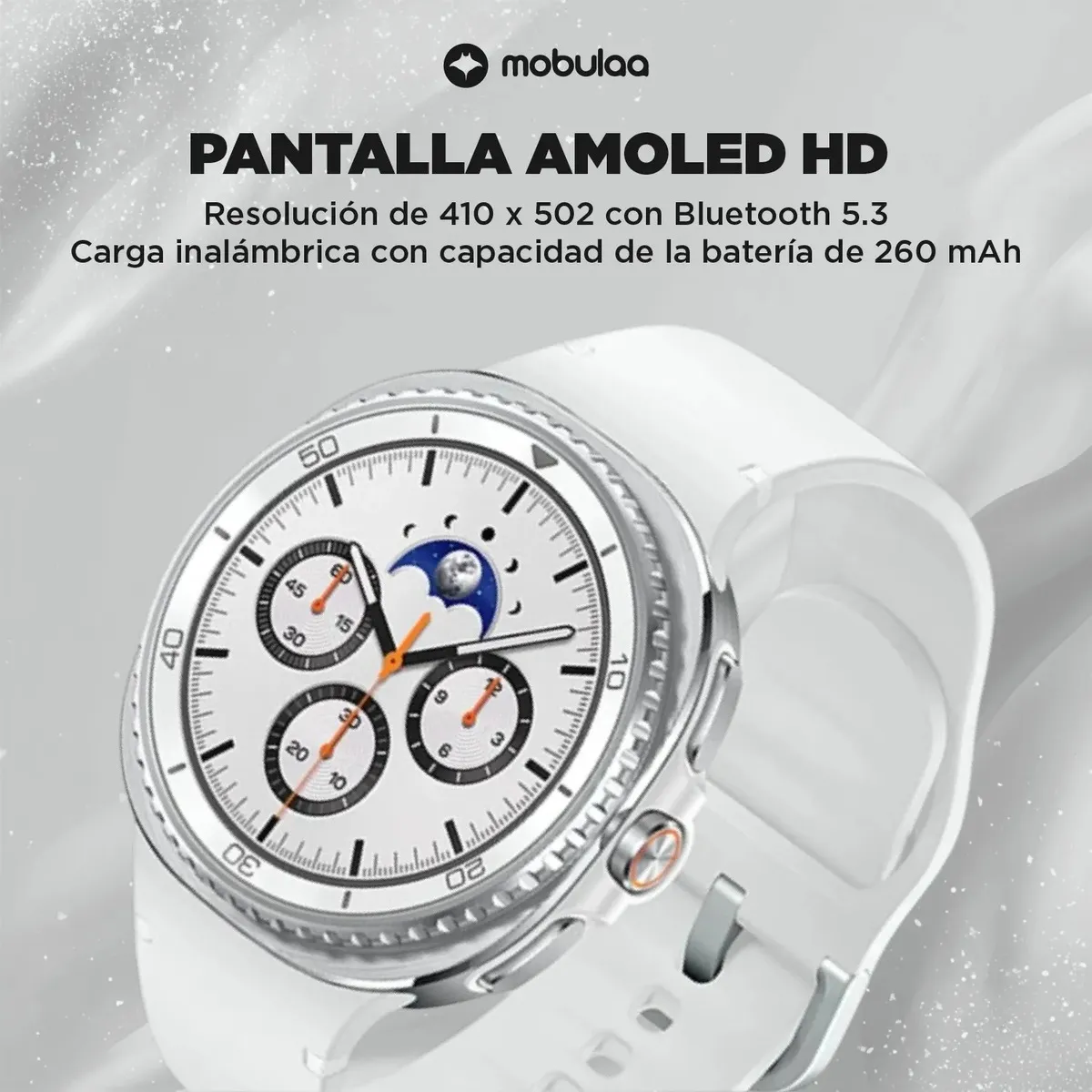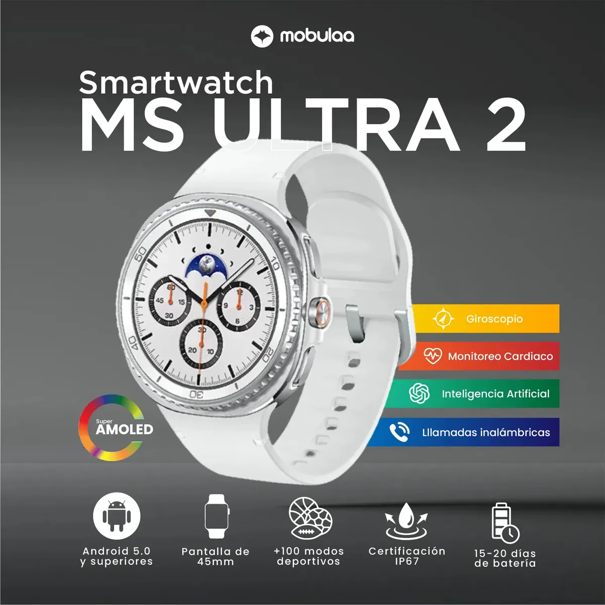 El nuevo Mobulaa MS Ultra 2 no es solo un reloj, es tu nuevo centro de comando personal. Diseñado para quienes no se conforman con lo básico, este smartwatch combina una estética minimalista en color blanco con una potencia interna soberbia. Su pantalla Super AMOLED HD de 45mm ofrece una nitidez sin precedentes (410 x 502 px), permitiéndote ver cada detalle incluso bajo la luz directa del sol.