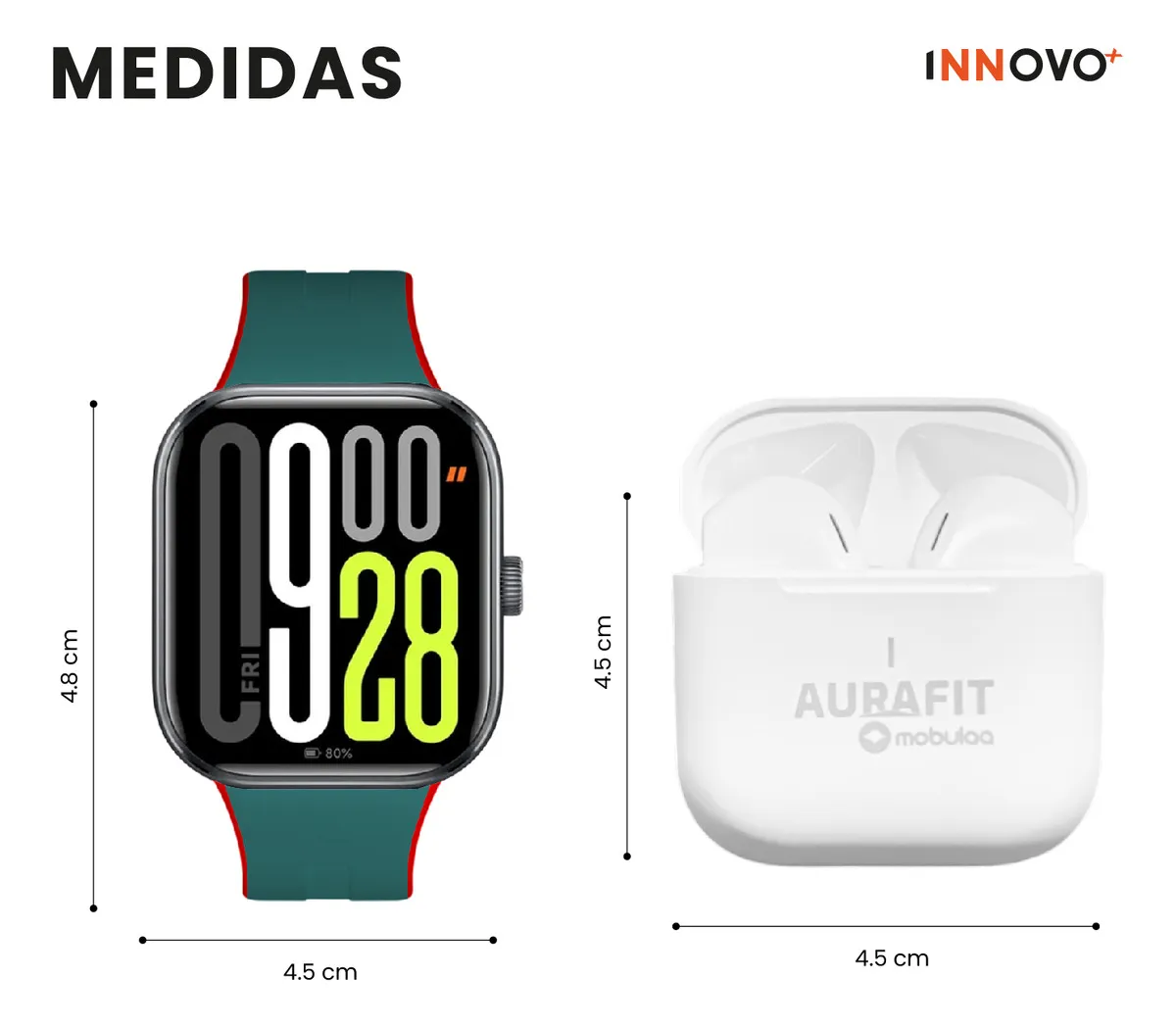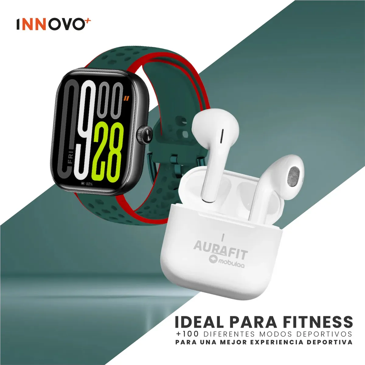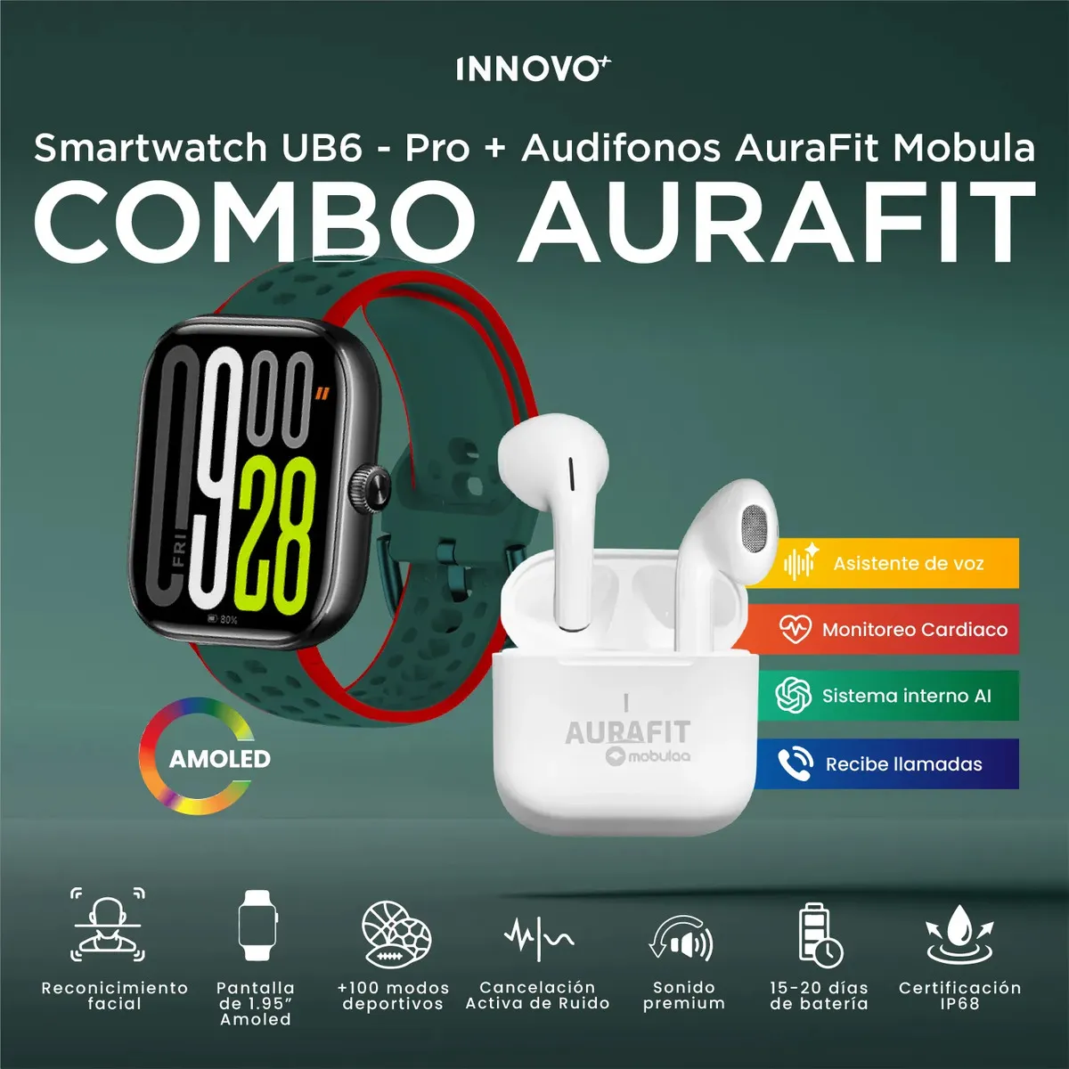 No es solo tecnología, es tu nuevo ecosistema de alto rendimiento. El Combo AuraFit de Innovo+ fusiona la potencia visual del Smartwatch UB6 Pro con la pureza auditiva de los audífonos Mobulaa. Diseñado para quienes no aceptan menos que la perfección en su día a día.