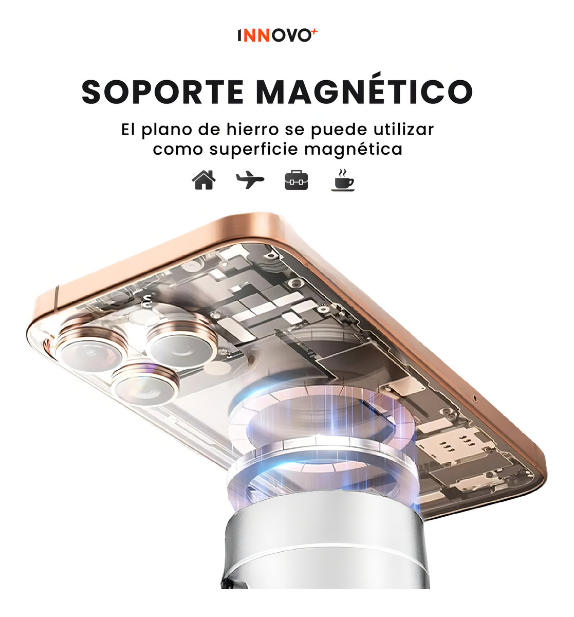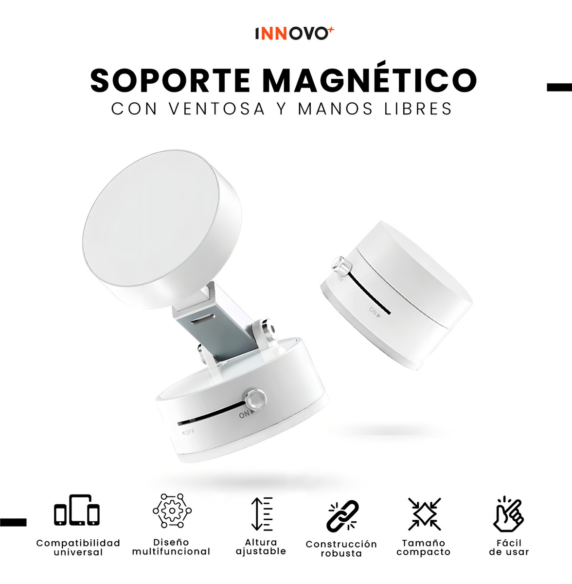 Mantén tu celular o tablet seguro, estable y siempre a la vista con el soporte magnético Innovo+, ideal para el hogar, la oficina, el coche o cualquier superficie. Su diseño compacto, portátil y ajustable lo convierte en el aliado perfecto para el uso diario.