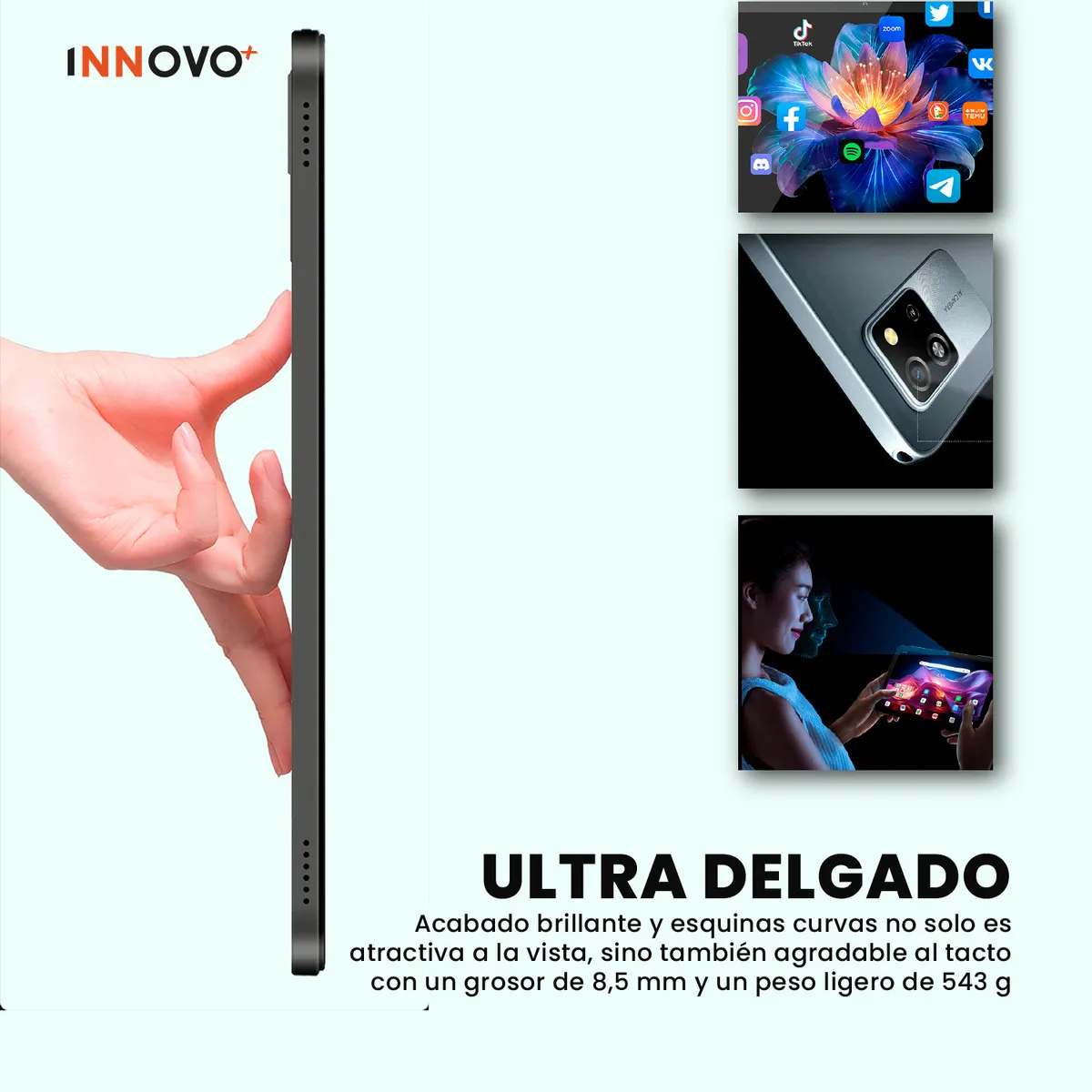 Diseño Premium: Grosor de solo 8.5 mm y peso ligero de 543 g con esquinas curvas para un agarre cómodo.