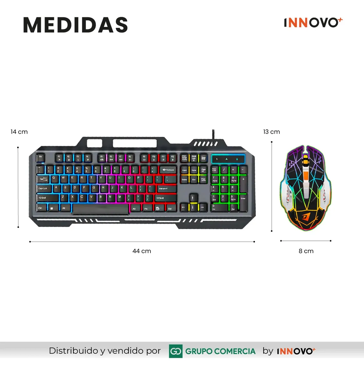 Dimensiones: Teclado (44cm x 14cm) | Mouse (13cm x 8cm).