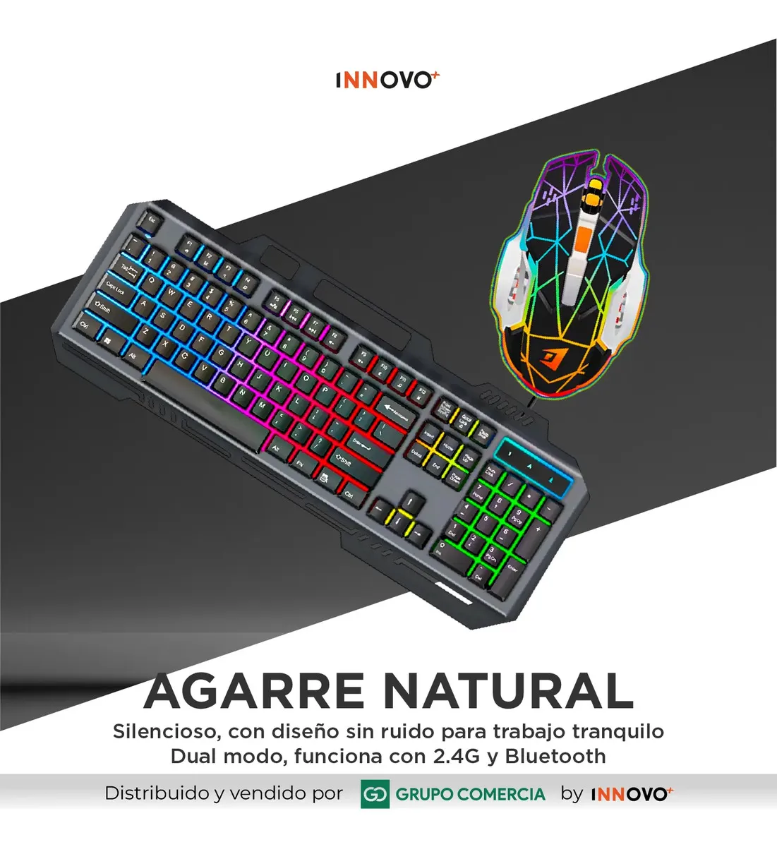 ¿Buscas el equilibrio perfecto entre la estética gamer y la funcionalidad profesional? El combo INNOVO+ ha sido diseñado para quienes no se conforman. Con una estética de vanguardia y tecnología de conexión híbrida, este kit es tu mejor aliado tanto para intensas sesiones de juego como para largas jornadas de trabajo.