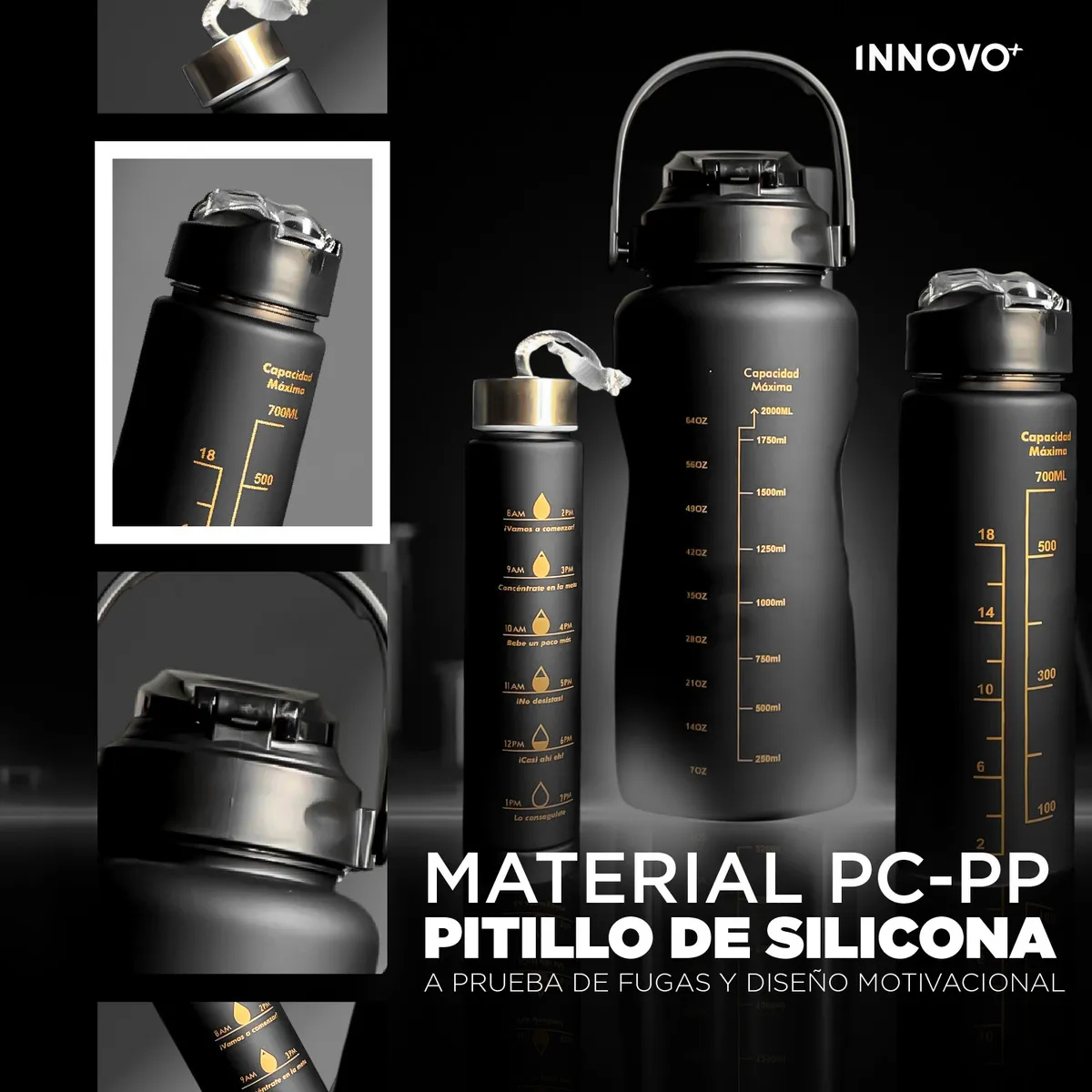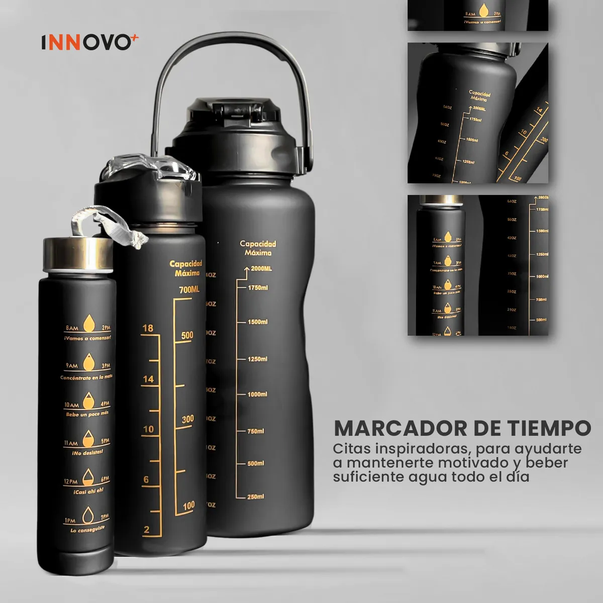 ¿Te cuesta beber suficiente agua durante el día? Con Termo 3 En 1 de Botellas Motivacionales Innovo+, mantenerte hidratado ya no será un reto, sino un hábito elegante y sencillo. Tres tamaños diferentes diseñados para acompañarte en cada momento: desde tu entrenamiento más intenso hasta tu jornada en la oficina.