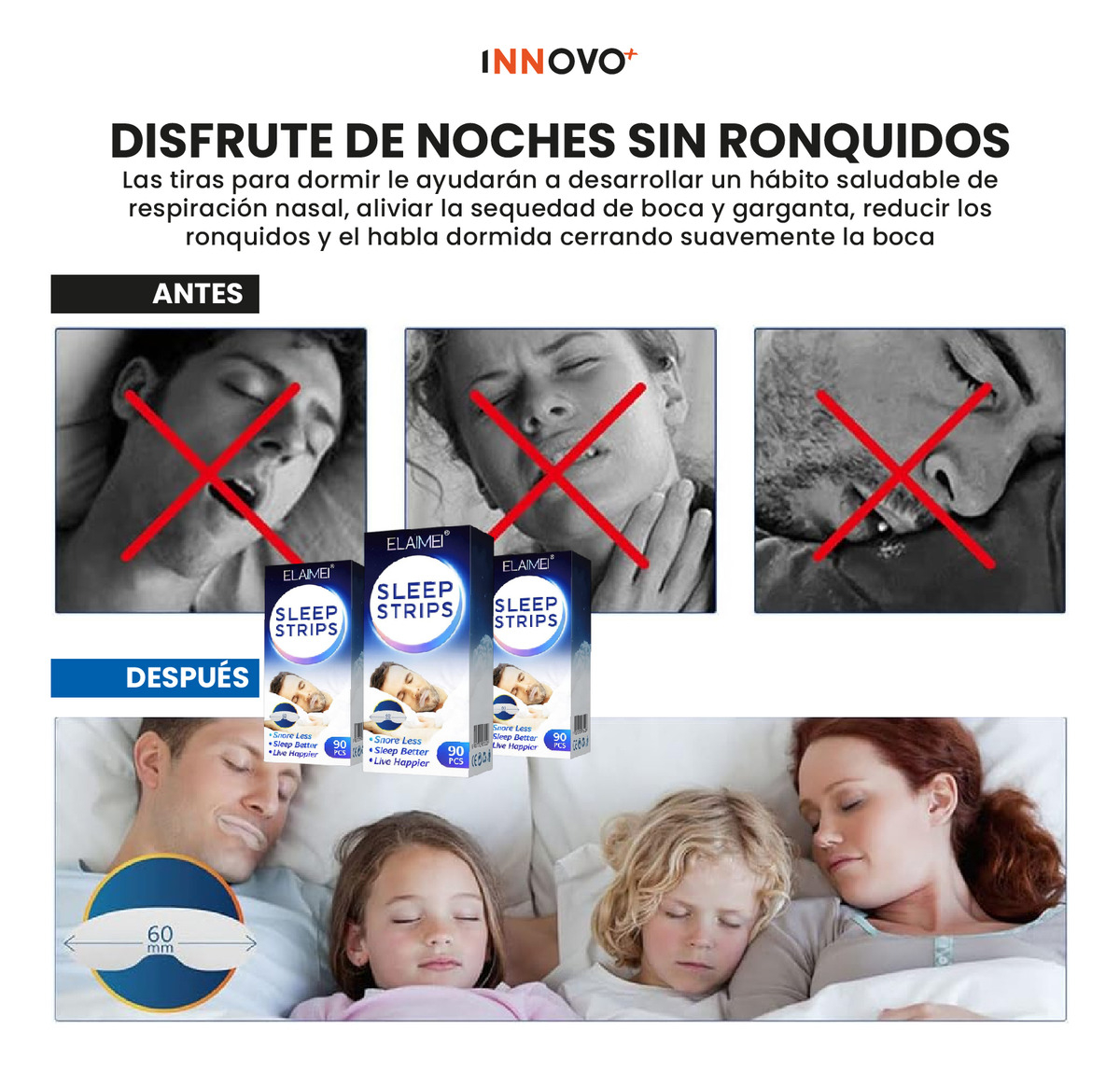 ¿Roncas o respiras por la boca al dormir? Descubre las Tiras para Dormir Sleep Strips ELAIMEI, la solución efectiva para mejorar tu descanso y promover una respiración nasal saludable.